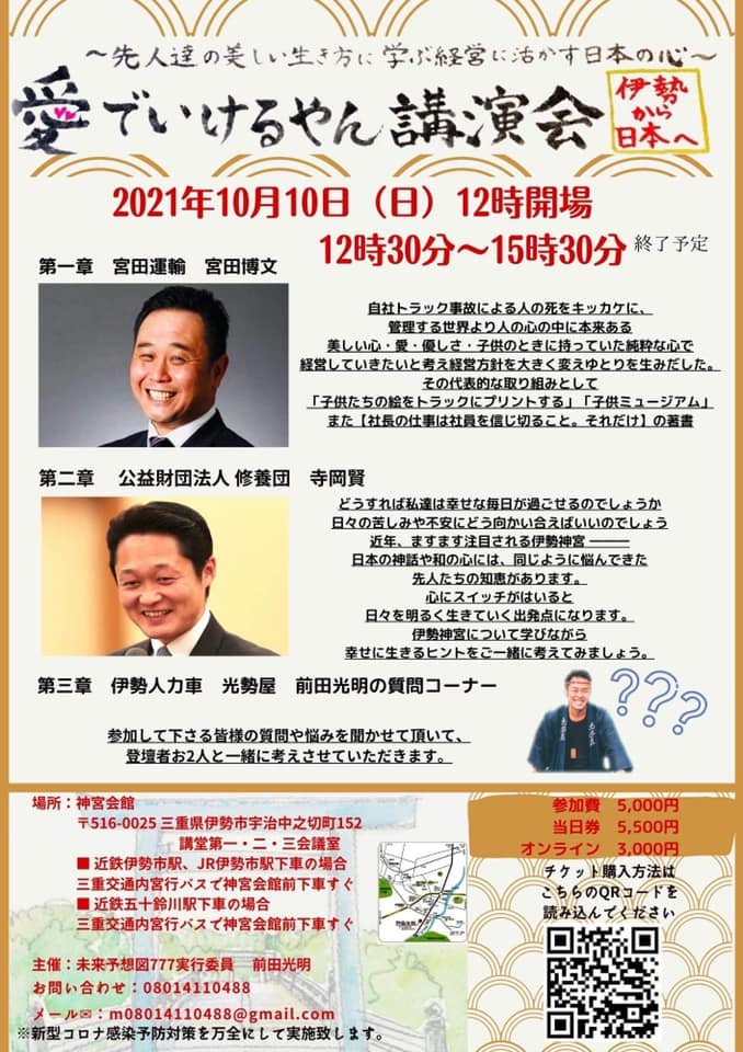 愛でいけるやん講演会 2021.10.10伊達の想い 三重は伊勢神宮近くにある神宮会館にて、 宮田運輸社長の宮田博文さんと修養団の寺岡先生の講演会に参加してきました。 主催のみつくん、いくちゃんが頑張ってました。 宮田さんもいくちゃんもみつくんも一度しか会っていないとは、思えない近しい感覚! ほんまに今のタイミングで聞けてよかった 『信はやがて愛になり、愛は超えて和と成す』 『今日1日を喜んで生きていこう』 記事一覧に戻る