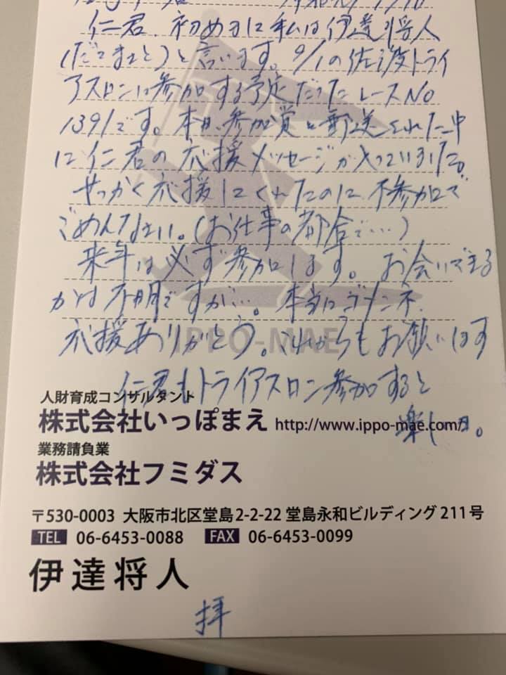 【ごめんね、仁 君&佐渡トライアスロンサイコー】 2019.09.10伊達のTAアイアンマン挑戦 反省… 9/1の佐渡トライアスロンを… 仕事の都合で不参加(DNS)した。 今日参加賞等が 送られて来た その中に応援メッセージが… 多分エイドで 俺の1391を探したんだろうなぁ… ごめんね🙏🙏 仁君… お詫びのハガキを書こう… 来年は必ず佐渡に 出場が確定だわ💪 記事一覧に戻る